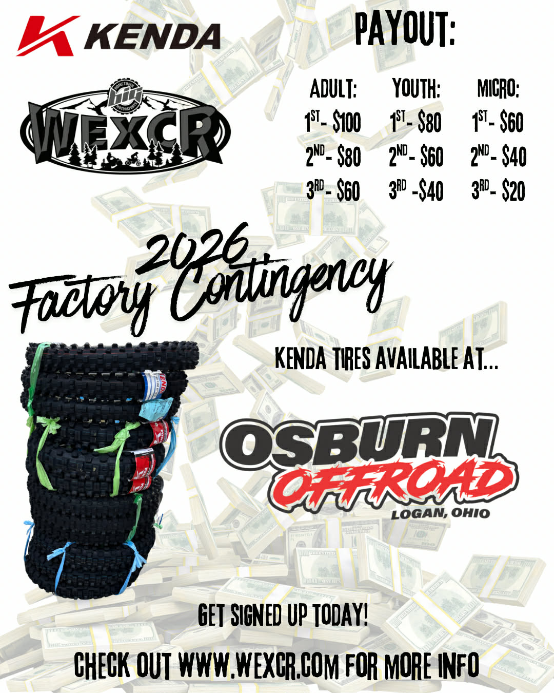 The Kenda Kash Awards Program is designed to reward racers who achieve racing success while using Kenda tires. Kenda Kash is offered to top finishers in all listed classes who use Kenda tires and display Kenda Decals. Kenda Kash is redeemable towards the purchase of tires through Kenda Tire.